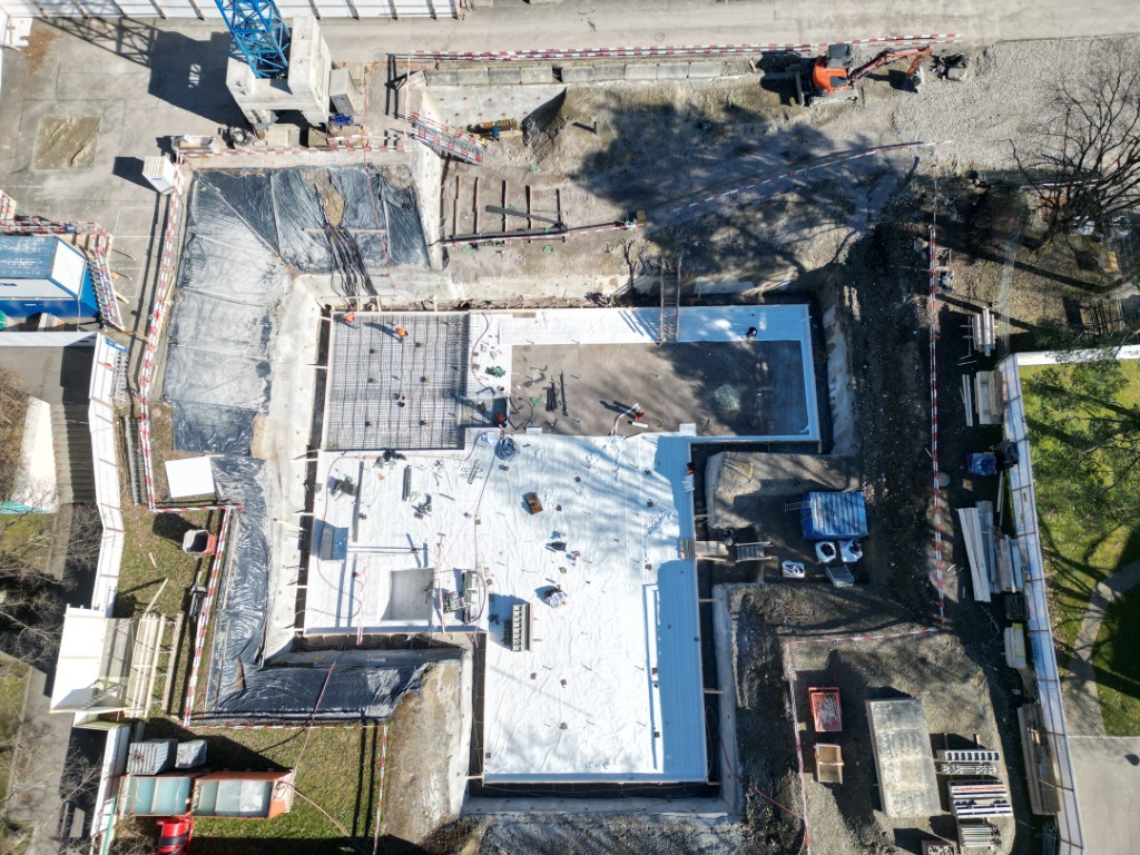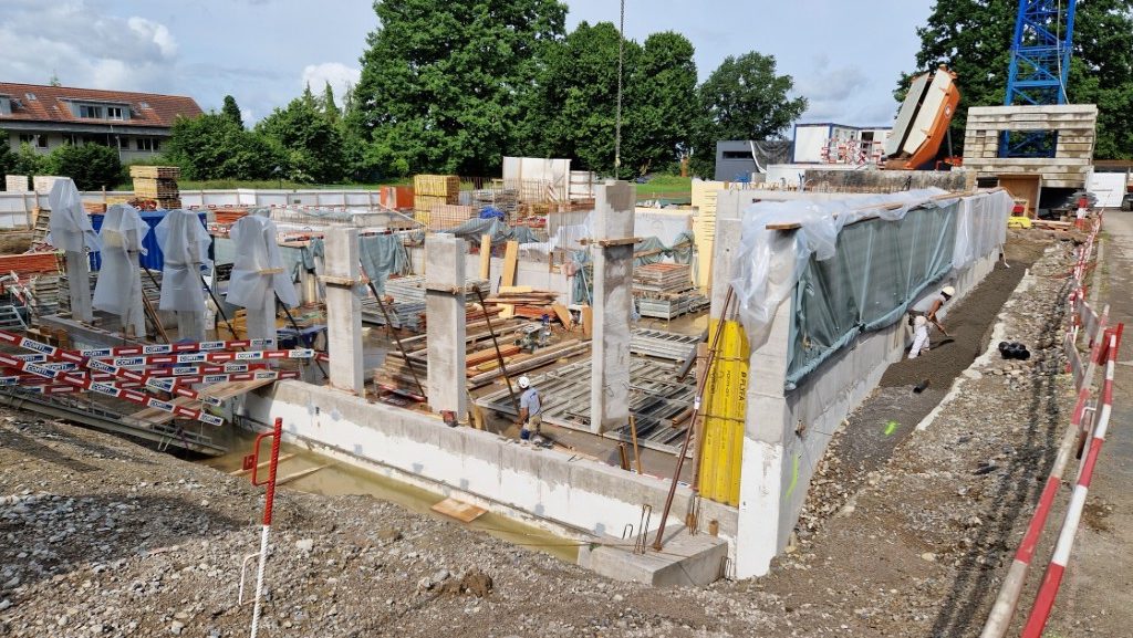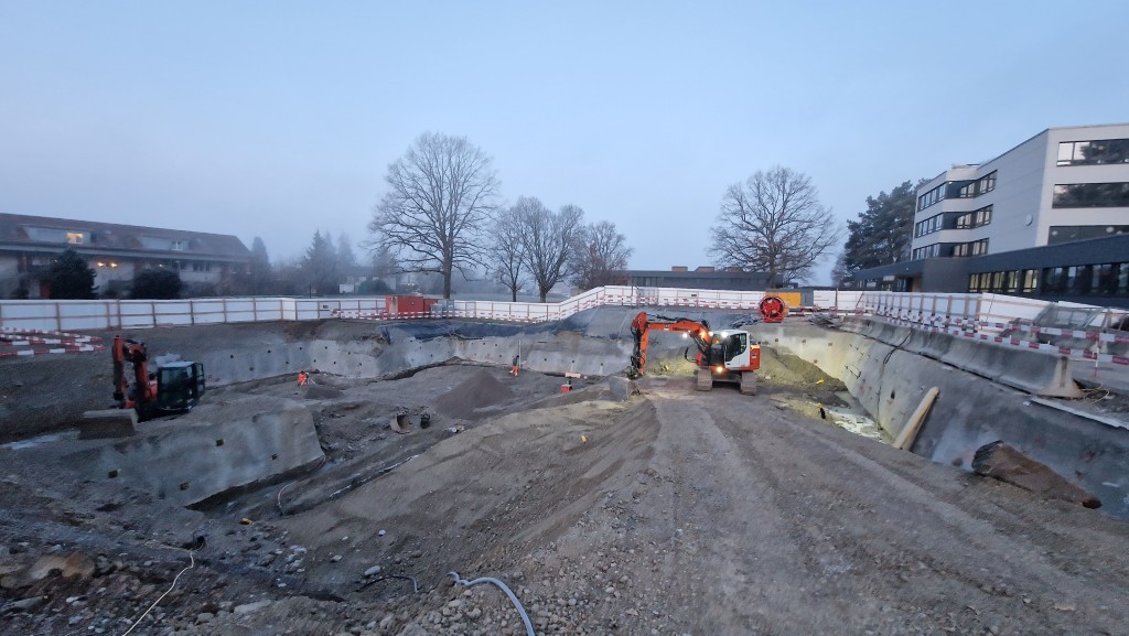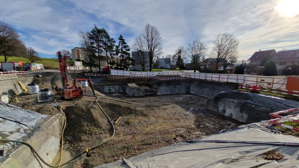 Die Baugrube wies eine Tiefe zwischen 5 und 7 Metern auf, wobei die Baugrubensohle bis zu 4 m in den unverwitterten Molassefels hineinreichte. Aufgrund des Wasseranstaues innerhalb der unverwitterten Molasse sowie der leichten Bauweise des Neubaus wurde die Bodenplatte mittels Mikropfählen zur Auftriebssicherung im Molassefels verankert.