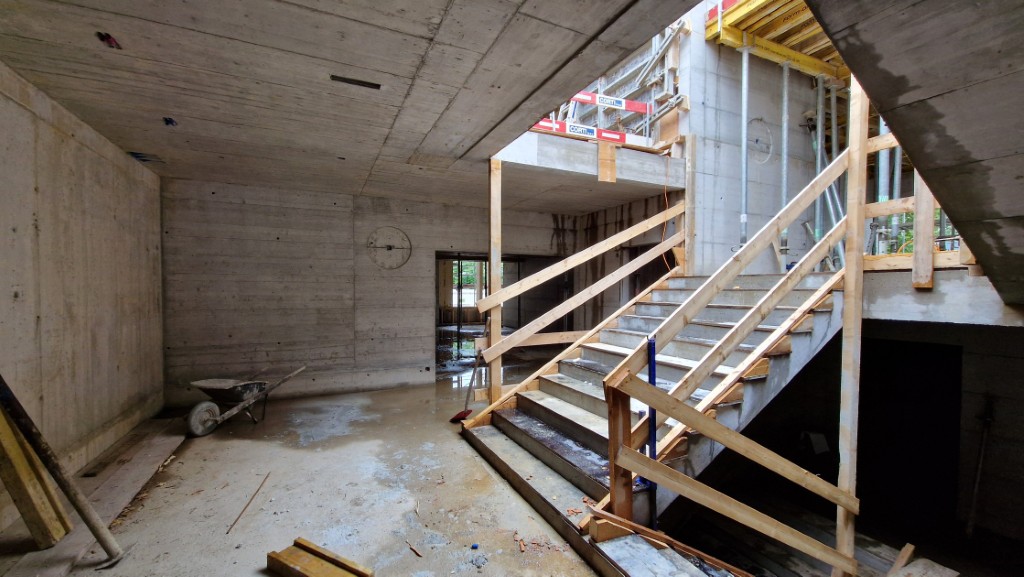 Ein weiteres Highlight stellt das Treppenhaus dar, das durchgehend vom zweiten Untergeschoss bis ins erste Obergeschoss mit Sichtschalung (Schalungstyp 4.14) ausgeführt wurde.